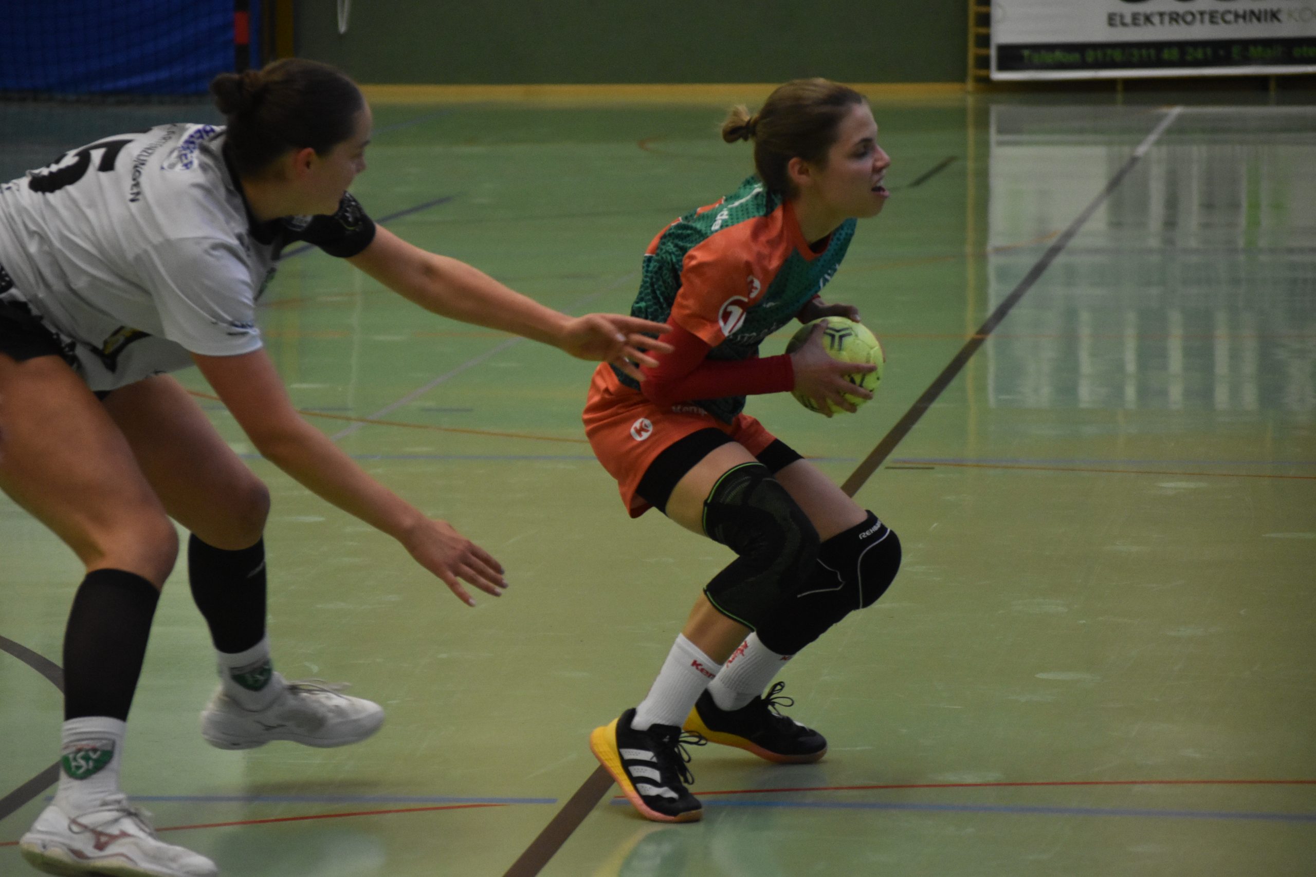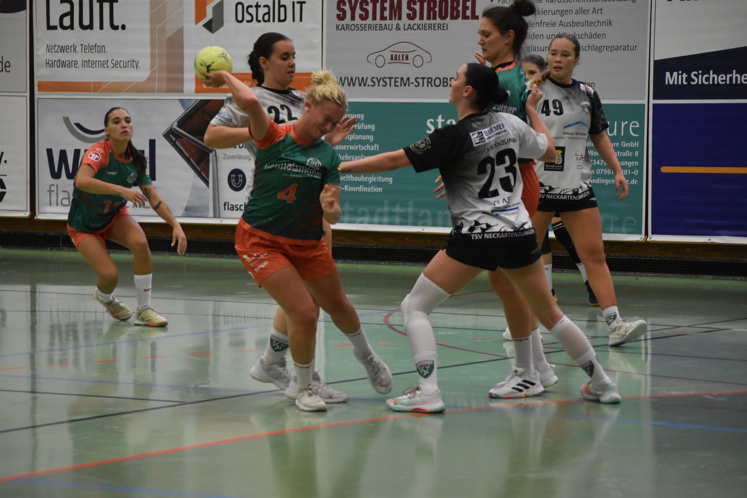 Die Partie begann für die SG2H-Damen bereits denkbar schlecht. Nach gut dreieinhalb Minuten führte der Gast mit 3:0, dazu musste die SG2H nach zwei Zwei-Minuten-Strafen früh in doppelter Unterzahl agieren. In dieser Phase konnte Clara Jörg allerdings den ersten Saisontreffer erzielen (5. Minute). Schnell zog Neckartenzlingen aber auf vier Tore davon, weshalb Trainerin Corinna Beyrle früh die erste Auszeit nahm – mit Wirkung. Im Angriff zeigte sich die SG2H danach treffsicherer, der Abstand pendelte sich zwischen drei und vier Treffern ein. Nach 20 Minuten stand es 9:12 aus Sicht der Gastgeberinnen.