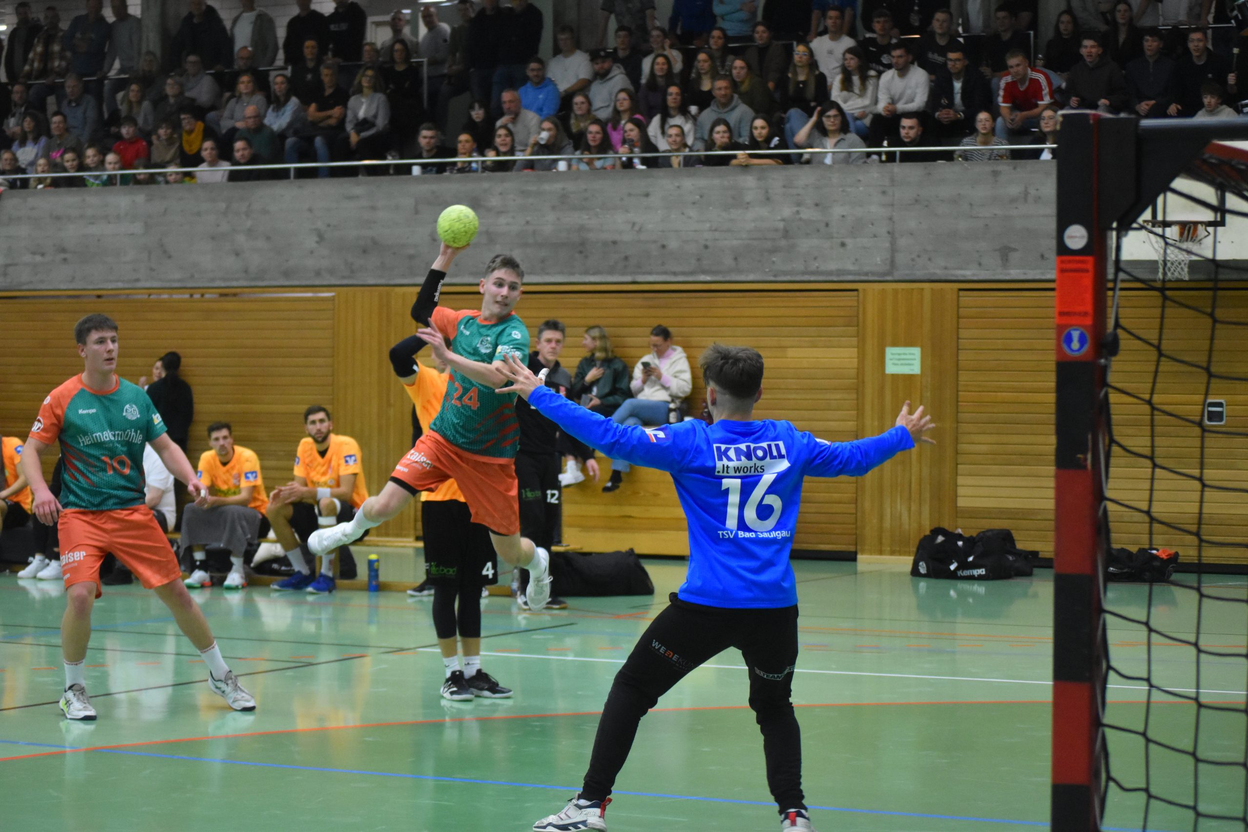 Nach Treffern von Achim Eiberger, Lukas Fürst und Yannik Haas führte die SG2H nach knapp drei Minuten mit 3:1. Der TSV konnte aber nach gut fünf Minuten zum 3:3 ausgleichen. Beim 4:4 konnte Bad Saulgau noch einmal in dieser Partie mit der SG2H gleichziehen. Danach zündeten die Hausherren den Turbo und erspielten sich bis zur 17. Minute eine satte Sieben-Tore-Führung (13:6). Bis kurz vor der Halbzeit konnte dieser Vorsprung gehalten werden, rund eineinhalb Minuten vor der Pause stand es 20:13 für die SG2H. Die letzten beiden Tore konnte allerdings der Gast aus Oberschwaben erzielen, sodass es mit einem 20:15 in die Kabine ging.